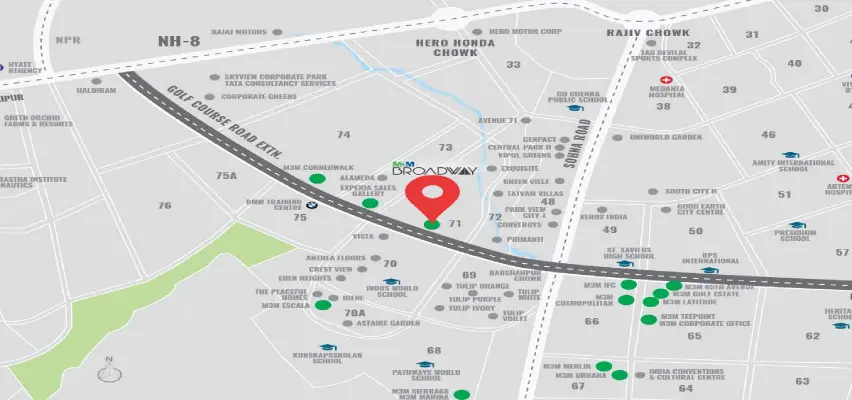 M3M Broadway sector 71 is located across 7.84 acres, it is made up of commercial spaces (Ground +22 Floors) and studio apartments (Ground +12 Floors). There is a Multiplex on the 3rd and 4th floors, a restaurant on the 1st floor, and fun zones on the 2nd and 3rd floors.